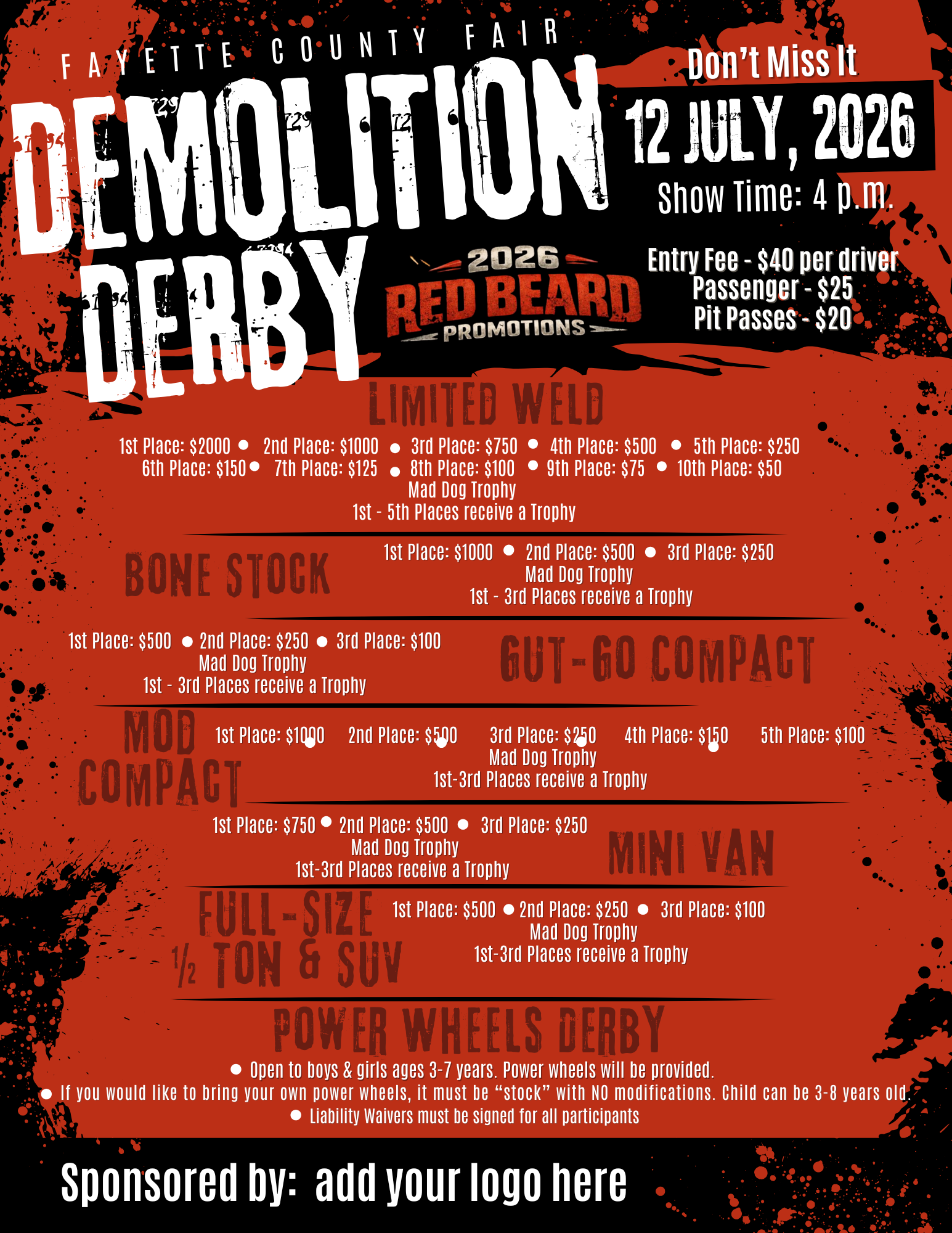 Are You Interested In Sponsoring The Demolition Derby? Email: fayettecofairads@gmail.com or checkout our Sponsorship Page