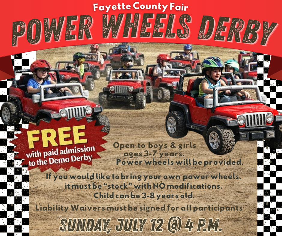 The Kid’s Power Wheels Derby will take place with the Demolition Derby on Sunday, July 12th @ 4 p.m.