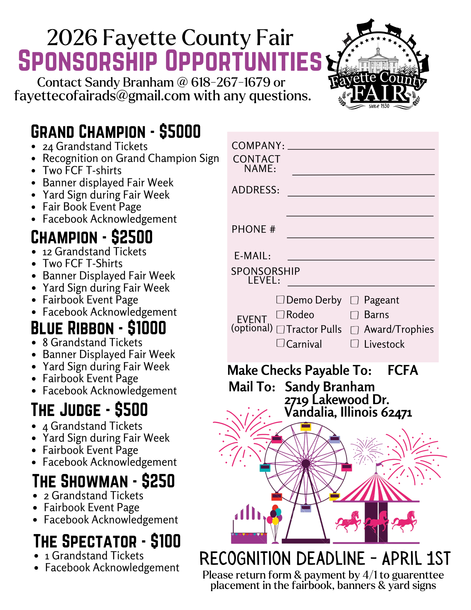 Please contact Sandy at fayettecofairads@gmail.com if you have any questions.